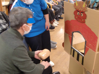 令和8年2月3日(火)通所フロアーにて「節分イベント」を開催いたしました。 豆まきはもちろん、職員作成の鬼の的に当てるイベントも非常に盛り上がりました。 豆まき後の写真撮影は、鬼3匹と恵方巻やでんでん太鼓をご利用者にもっていただき撮影しました。 笑いがたえないイベントとなりました。